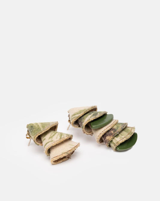 Thus, small stylized feathers were created from the flannel, carefully hand-sewn, and small pieces of recycled porcelain were added, which together brought to life the pieces of this collection.