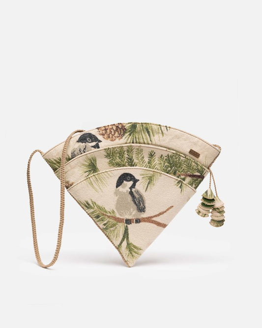 A fabric where designs of small robins, pine cones and pine needles became the inspiration. During the creative process, the idea of exploring the natural overlapping of bird feathers represented in the fabric came up.
